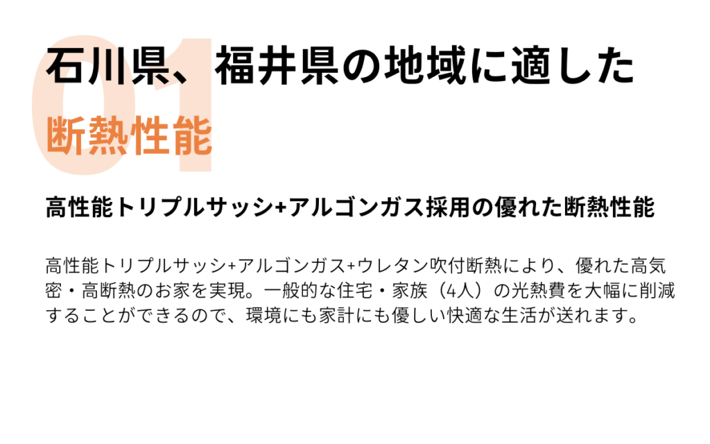 PG HOUSEでは、石川県、福井県の地域特性に適したZEH基準を超える HEAT20 G2グレード(断熱等級6)の数値(Ua値0.46以下)を全棟達成し高気密・高断熱で快適な住まいの提供に努めています。