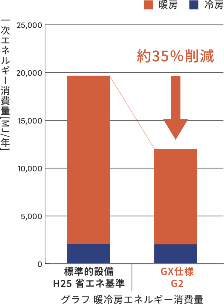 また、GXで定められている一次消費エネルギー35%削減に対しても、省エネ効果の高い設備を標準搭載することにより全棟達成しています。